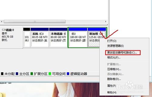 单击选中要更改盘符的硬盘分区(本例为新加卷:J),选中后单击鼠标右键,在右键菜单中选择”更改驱动器号和路径...“.